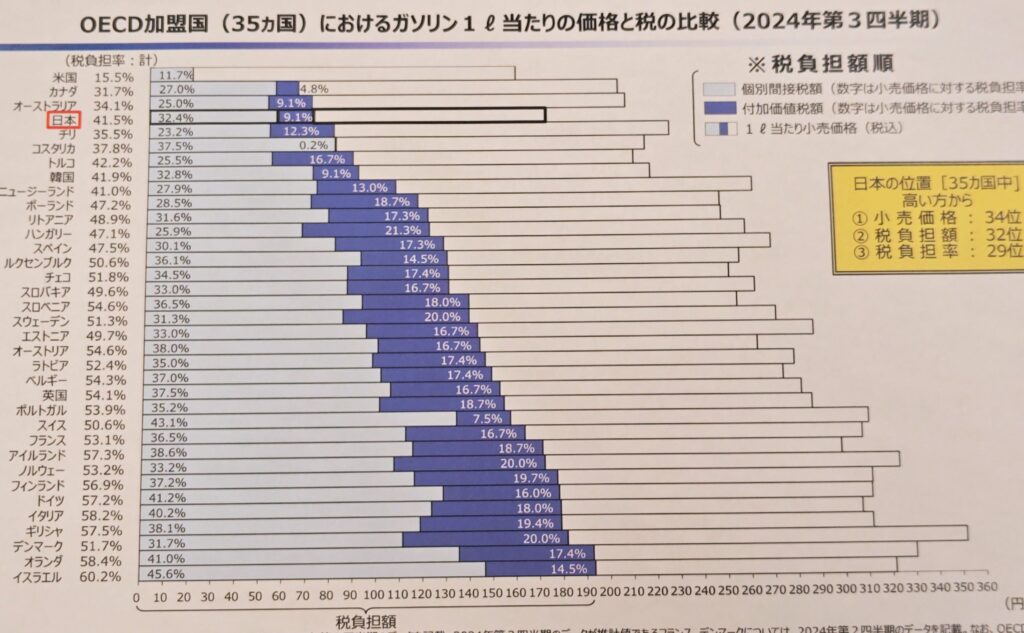 (3/18)少し古めのデータです。(日本は暫定税率廃止前)(財務省が出した資料で「日本は世界の中でガソリンの税負担は低いよ」と示すかのようにみえるかもしれません)