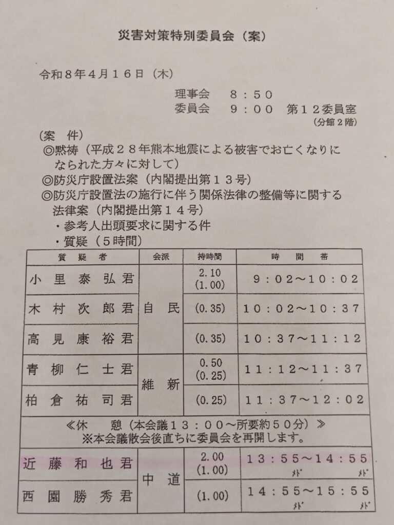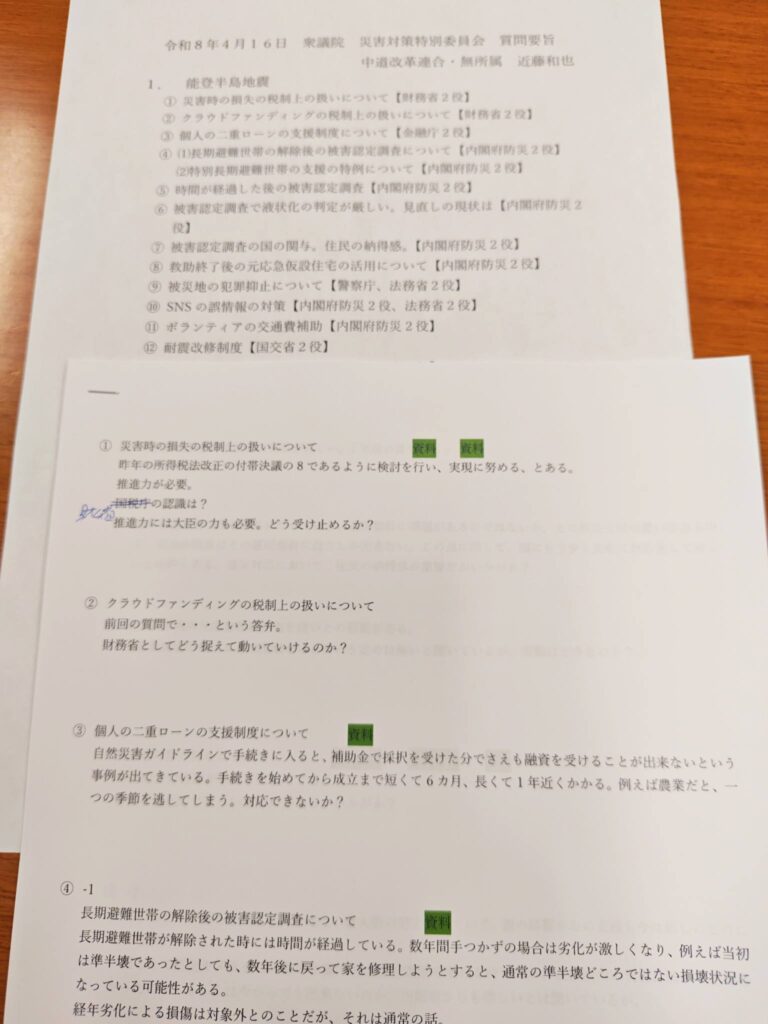2026/4/16 木曜日 / 最終更新日 : 2026/4/16 木曜日 事務所 活動報告 (4/15)明日、災害対策特別委員会で防災庁設置法案の質疑。 複数回行なわれるはずなので、今回は能登半島地震のことを中心に。 能登のまだ抱えている課題解決と経験値を踏まえてこそ、より実践的な防災庁になるとの思いで質疑に立ちます。 FacebookXBlueskyCopy